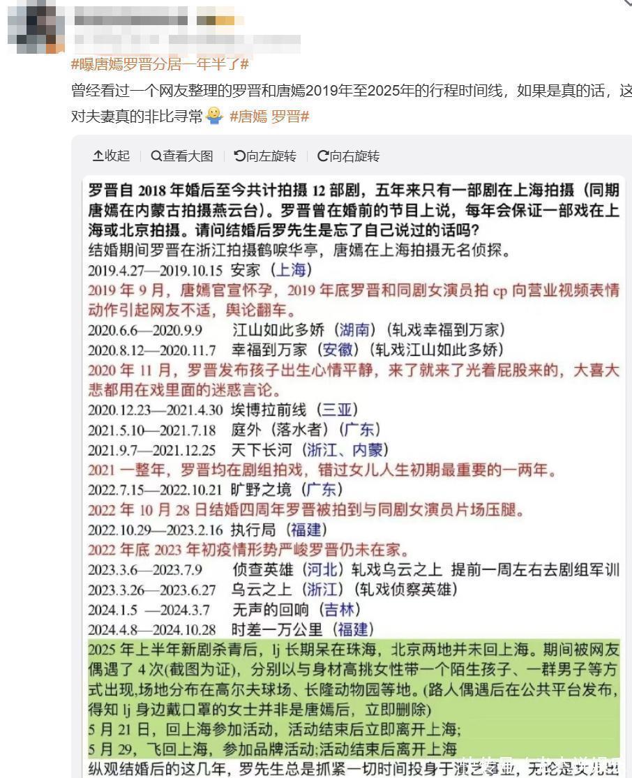 更重要的是,有一部分粉丝还晒出了罗晋婚后的时间线,证明了他和唐嫣长期分居的事实。从爆料来看,2018年唐嫣和罗晋正式举行婚礼,婚后没多久罗晋便一直在无缝进组,就连唐嫣怀孕期间也是如此。